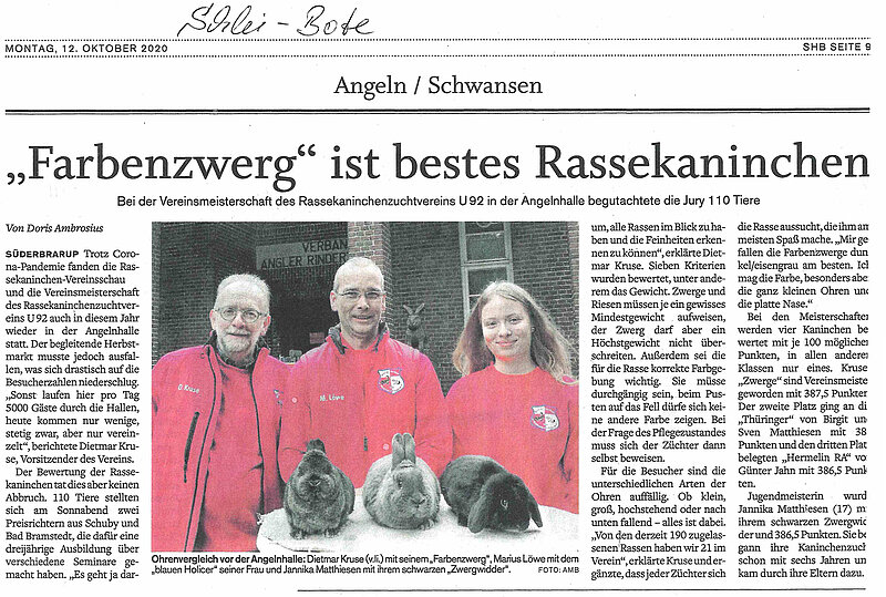 Zur Teilnahme an der Vereinsmeisterschaft ist jedes Mitglied des U 92 berechtigt. Der Züchter benennt vor der Bewertung fünf Tiere seiner Rasse. Die niedrigste Bewertung liefert das Streichergebnis, somit gelangen vier Tiere in die Wertung (max. 320 Pkt möglich).